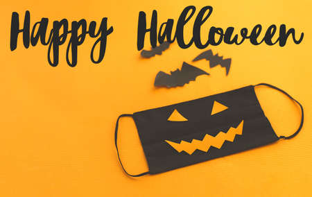 Happy Halloween text on evil face mask with jack o lantern smile on orange background. Halloween 2020, stay safe during coronavirus. Handwritten sign, seasonal greeting card