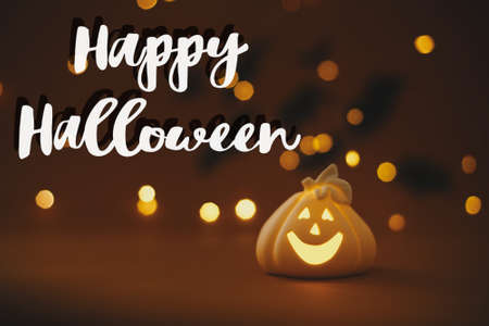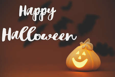 Happy Halloween text sign on glowing Jack o lantern pumpkin on orange background with lights and flying black bats. Season's greeting card. Handwritten happy halloween text