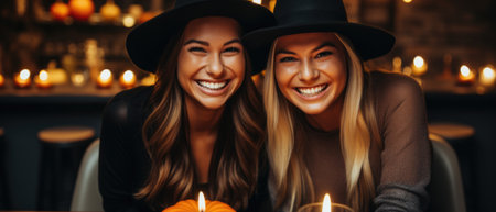 Happy cute girls wearing Halloween witches costumes having fun at Happy Haloween party celebration. Magical holiday funny festive fall night celebration invitation background. Portrait.