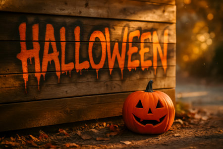 A carved pumpkin with a happy face beside a halloween sign on wooden boards