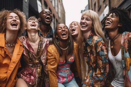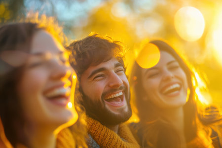 A diverse group of friends laughing and enjoying a joyful moment outdoors in a warm atmosphere