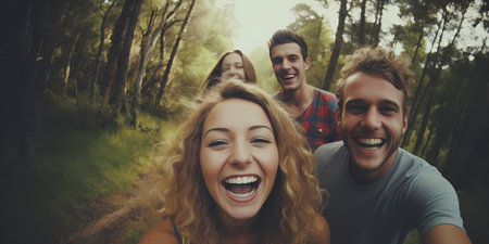 Four cheerful friends enjoy a joyful moment together outdoors, expressing happiness and friendship. The vibrant colors and lively atmosphere depict unity, positivity, and celebration of joyful connections surrounded by nature.