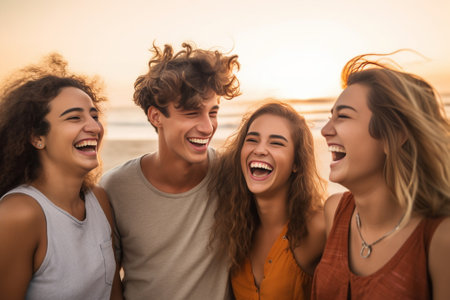 Group of beautiful young people bonding and smiling while walking by the beach together : Generative AI