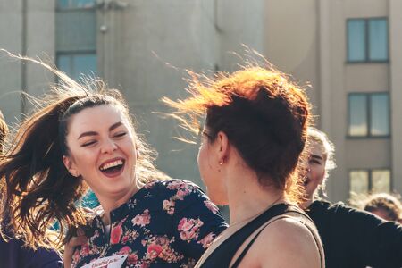Multiracial friends having fun laughing together outside, Group of young people socializing talking and joking on urban street, Youth community with guys and girls meeting in city center.