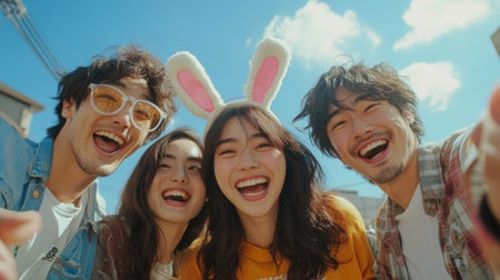 A group of joyful friends smiling and laughing under a bright blue sky, with playful bunny ears and casual outfits adding fun vibes.