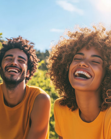 Two young adults enjoy a sunny day, sharing laughter as their wind-swept hair dances in the gentle breeze, embodying the joy of outdoor adventures and friendship.