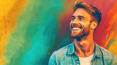 Joyful man at a colorful street festival, smiling with confetti in the air, vibrant energy and celebration