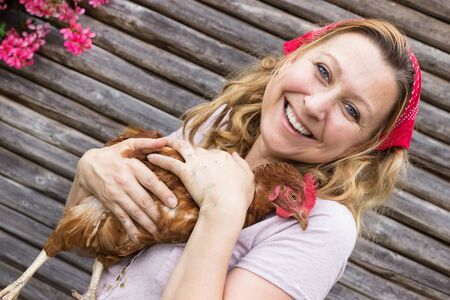 Happy farmer with a chicken in front of a wooden background