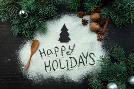 Happy Holidays text sign on stylish rustic frame of pine branches, cones, gingerbread cookies,thread, cinnamon, anise on rural wooden table. Season's greeting card. Flat lay