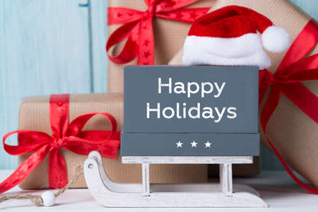 Happy Holidays text, Christmas gift boxes and santa hat, wooden background