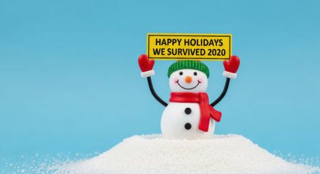 A cheerful snowman wearing a scarf and hat holds a sign that says Happy Holidays We Survived 2020.