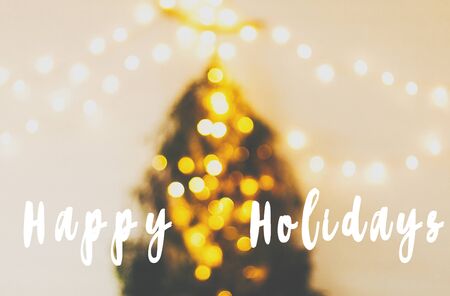 Happy Holidays text on golden Christmas tree lights bokeh in evening festive room. Atmospheric christmas eve. Season's greetings card. Handwritten sign. Merry Christmas!