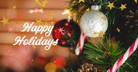 Image of happy holidays text over christmas decorations on yellow background. Christmas, tradition and celebration concept digitally generated image.