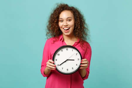 Portrait of surprised african girl in pink casual clothes holding round clock isolated on blue turquoise wall background in studio. People sincere emotions, lifestyle concept. Mock up copy space