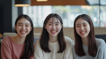 Generative AI : Three asian woman are chatting at coffee shop Feeling enjoy and happy