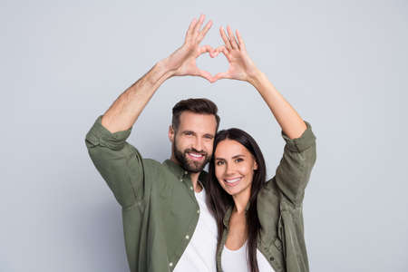 Portrait of attractive sweet gentle cheerful couple hugging showing heart symbol romance isolated over grey pastel color background