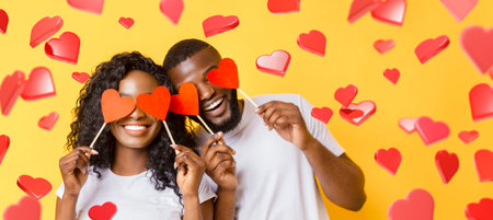 Young Couple Enjoys Love by Covering Eyes With Red Hearts Against Yellow Background