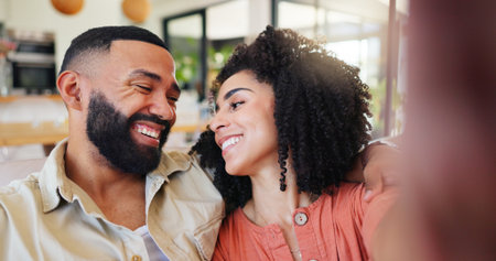 Couple, selfie or happy with hug on couch with laugh, love or connection for post on web in home. Man, woman and embrace with smile for photography POV, profile picture or social network at apartment