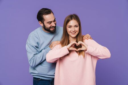 Picture of happy loving couple make heart love gesture isolated over purple background.