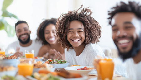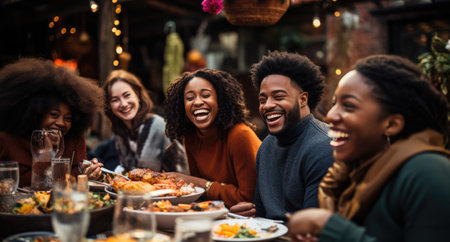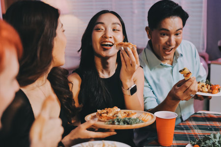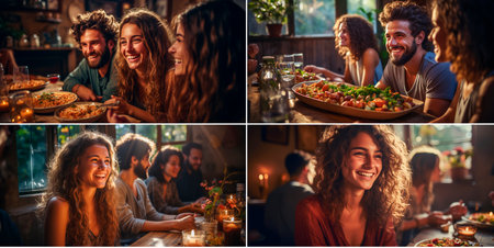Friends enjoying a joyful meal together in a cozy dining room, sharing laughter and delicious food during a festive gathering
