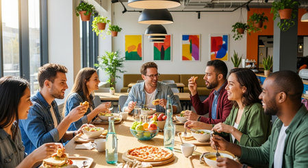 A group of smiling, diverse young adults shares a meal of pizza, sandwiches, and salads at a long wooden table in a bright, modern cafe. They are happily chatting and enjoying each other's company during a casual lunch break.