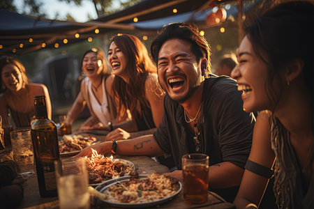 Asian Friends Camping enjoying outdoor life, celebrating a holiday event.Generated with AI