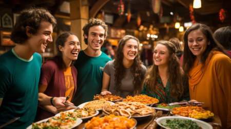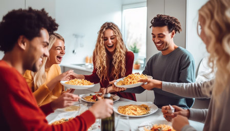 A group of friends enjoying a delicious pasta dinner at home. Celebrate Thanksgiving with laughter and delicious food. A lifestyle concept that showcases the joy of dining with loved ones.