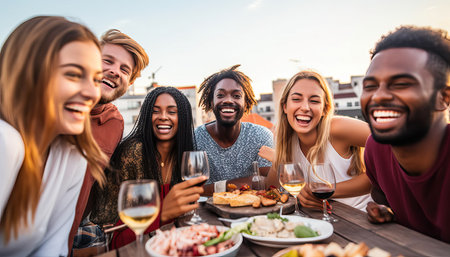 A group of six friends, diverse in ethnicity and age, sit around a table laden with food and drinks, enjoying a meal together in an outdoor setting with a city view.