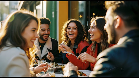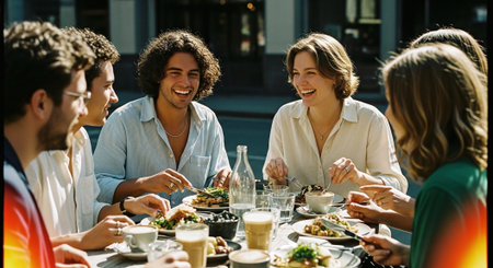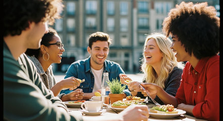 A group of friends enjoying a meal outdoors, laughing and sharing food at a table, with a sunny atmosphere and urban background