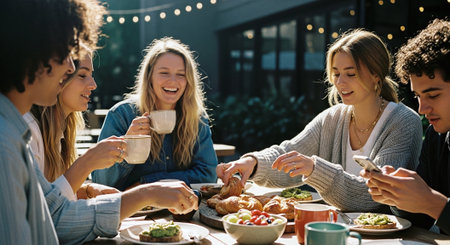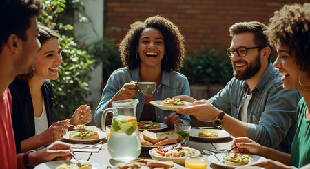 A group of friends enjoying brunch outdoors, sharing food and drinks, with a sunny atmosphere and casual attire