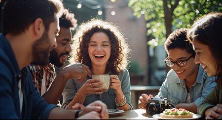 A group of friends enjoying a meal outdoors, laughing and sharing stories, with a camera and a cup of coffee on the table