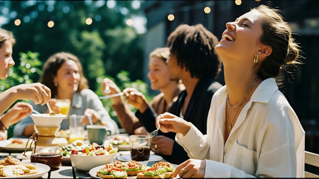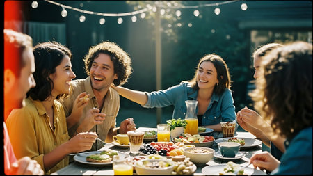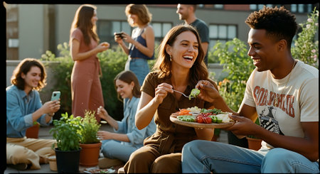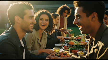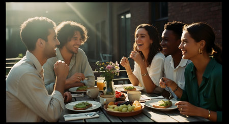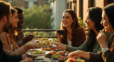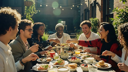 A group of diverse friends enjoying a meal together outdoors on a sunny day
