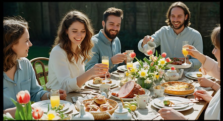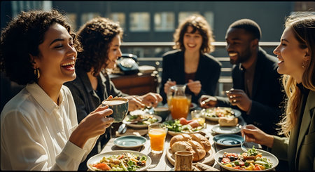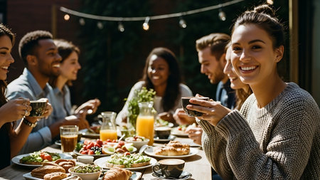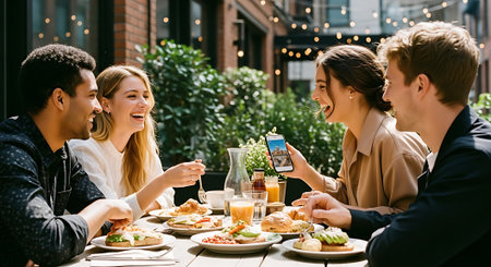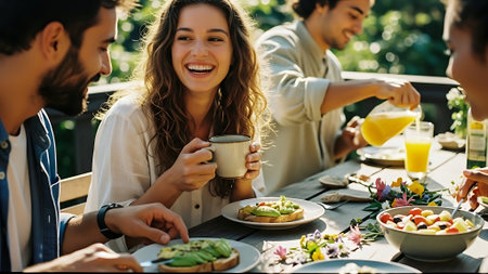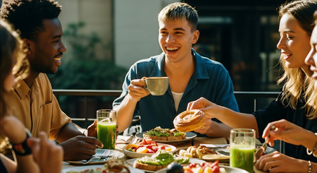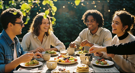 A group of four friends, two men and two women, of different ethnicities sit around a table filled with breakfast food, laughing and socializing in an outdoor setting with greenery in the background.