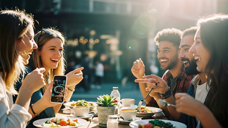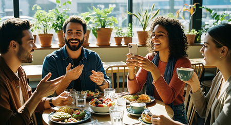 A group of friends enjoying a meal together at a cafe, smiling and taking photos, with various dishes on the table