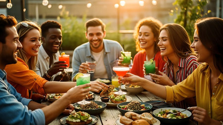 A group of five friends, diverse in ethnicity and age, sit around a table laden with food and drinks, smiling and laughing together in a casual outdoor setting.