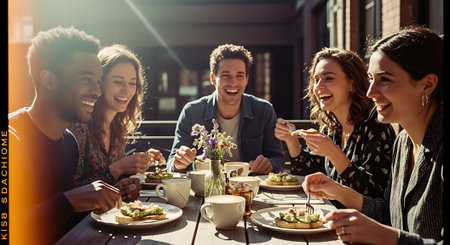 A group of friends enjoying a meal together at a cozy cafe, smiling and sharing food, with a bright window view