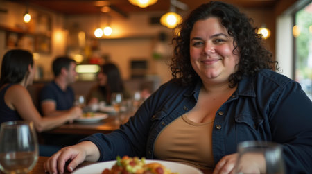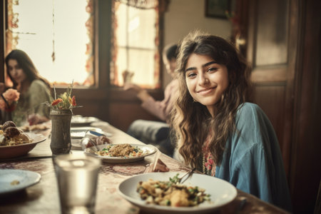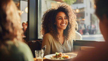 Female Hispanic teenager socializing dining room light conversation. Generative AI AIG23.