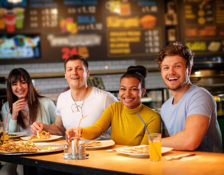 Cheerful multiracial friends having fun eating pizza in pizzeria.