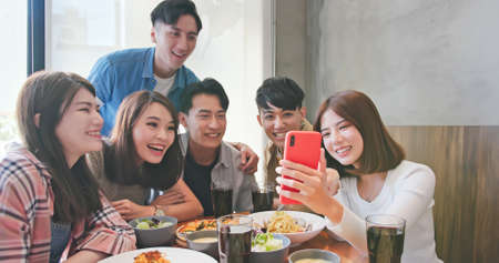 high angle shot of asian young six friends taking selfie in restaurant happily