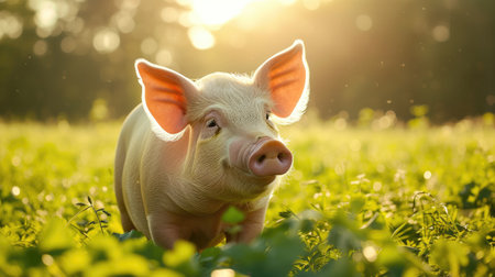 A farm pig stands in a lush green pasture surrounded by vibrant grass and trees The sun shines brightly as the pig snorts and looks around enjoying its day outdoors.
