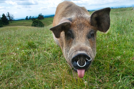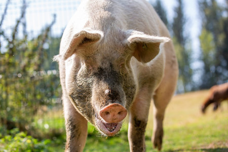 Pig portrait at free range organic pig farm - happy smiling pig with selective focus on pig nose
