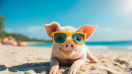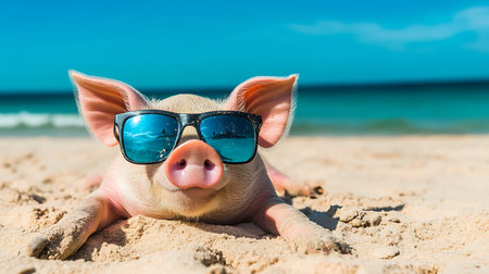 A pig wearing sunglasses relaxes on a sandy beach with the ocean in the background.