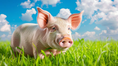 Adorable piglet standing on lush green grass under a bright blue sky with clouds. Young farm animal. Concept of nature, agriculture, rural life, livestock.