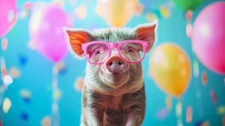 Adorable pig wearing pink sunglasses at colorful birthday party. concept of playful celebrations, cute animals, festive fun, joyful moments, funny pet, cute animal Summer.