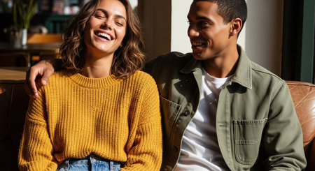 A young couple shares joyful laughter while sitting close in a warm, inviting cafe. Outside, daylight streams through the window, highlighting their happiness.