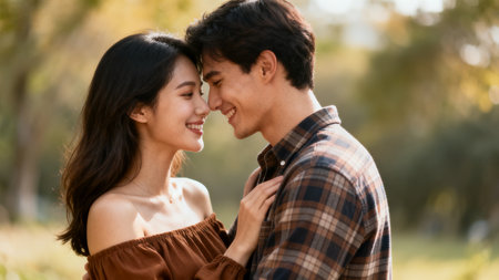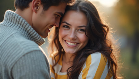 A young couple, a man and a woman, share a tender moment in a sun-drenched park, radiating happiness. The womans bright smile and the mans affectionate gaze create an atmosphere of love and connection, enhanced by the soft golden light surrounding them.