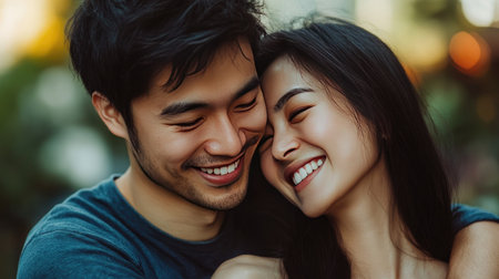 An intimate moment as an Asian couple holds each other, the man smiling warmly at his fiancae, expressing trust and care