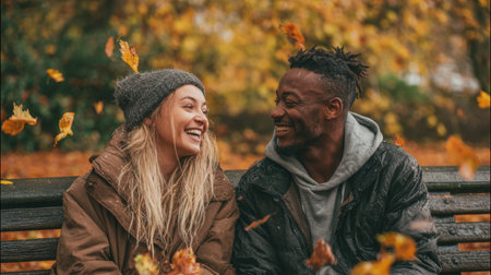 A joyful couple shares a moment in a park during autumn, laughing and surrounded by colorful falling leaves, capturing the essence of love and connection.