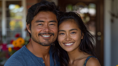 A black man and an Asian woman share a joyful moment smiling widely. The setting highlights their happiness with an emphasis on diversity and family unity.