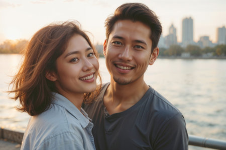 Portrait of Asian happy couple enjoying view on city embankment at sunset and looking at camera